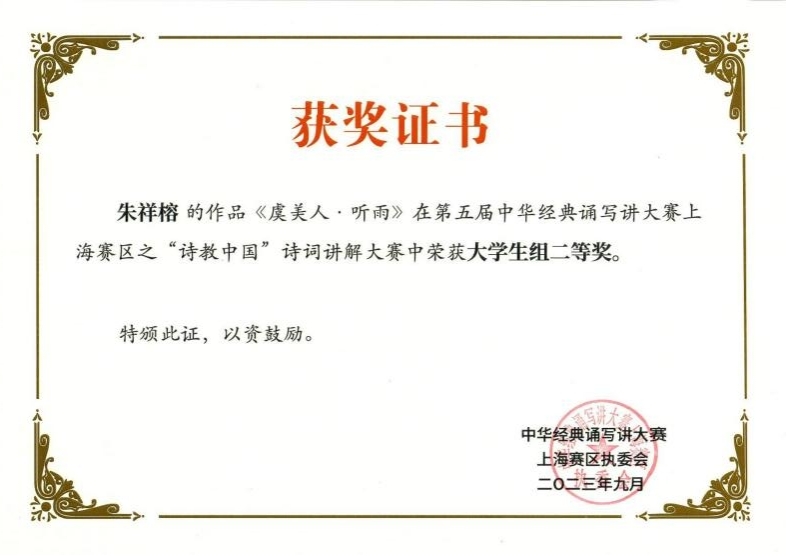 朱祥榕同学的讲解作品《虞美人·听雨》(指导教师神慧)获大学生组二等奖。