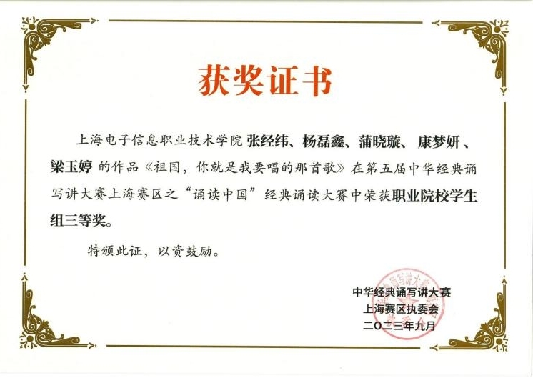 张经纬、杨磊鑫、蒲晓璇、康梦妍、梁玉婷五位同学的诵读作品《祖国,你就是我要唱的那首歌》(指导教师杨洋)获职业院校学生组三等奖。