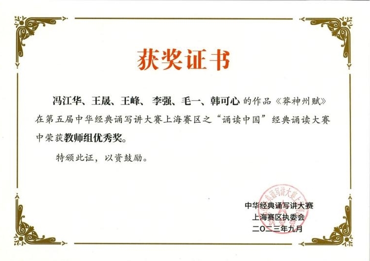 教育部、国家语委主办的第五届中华经典诵写讲大赛(上海赛区)各类奖项已揭晓,我校师生共获奖8项,其中一等奖1项,二等奖2项,三等奖1项,优秀奖4项。