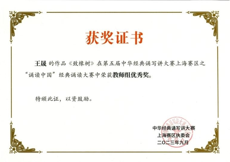 王晟老师的诵读作品《致橡树》获教师组优秀奖。