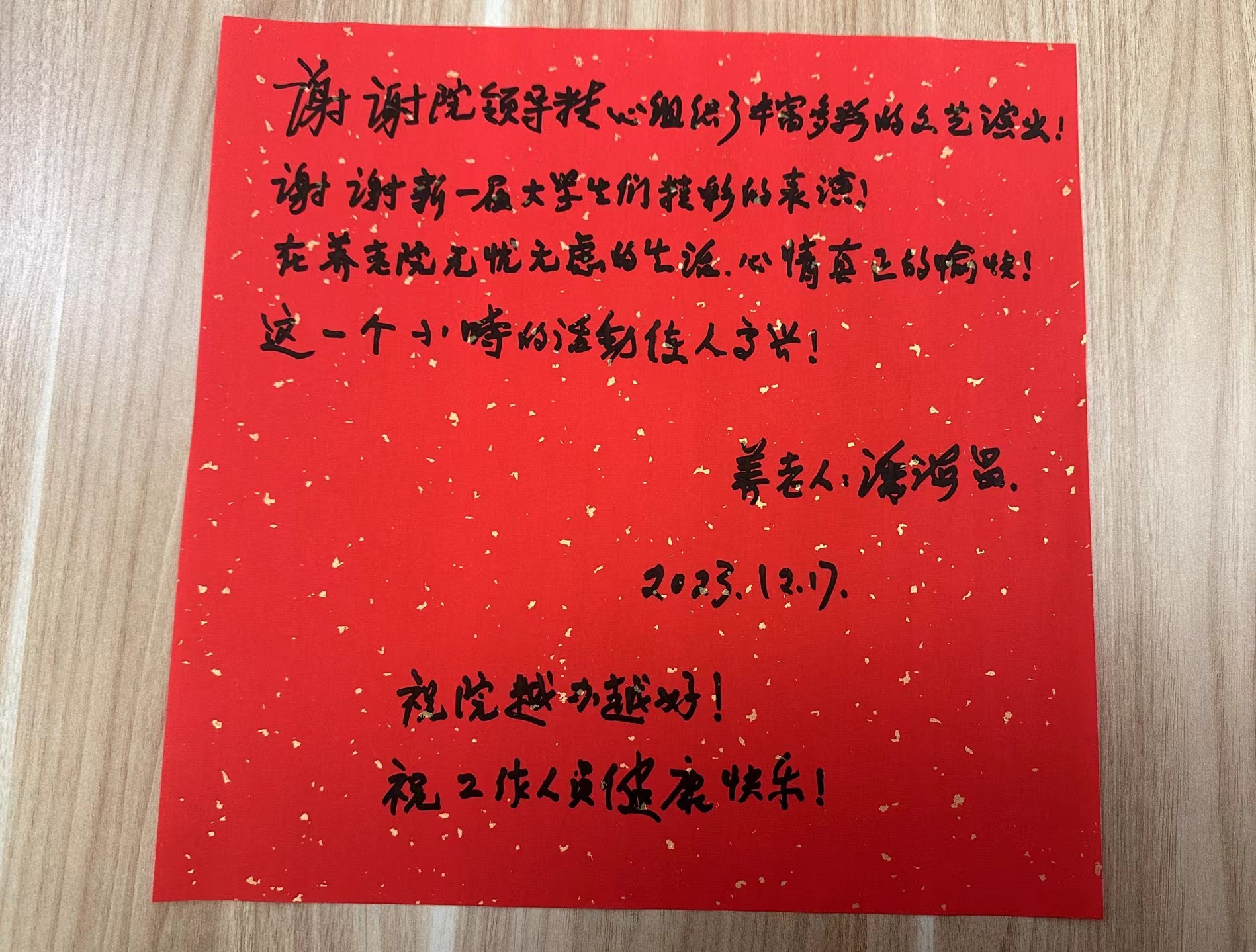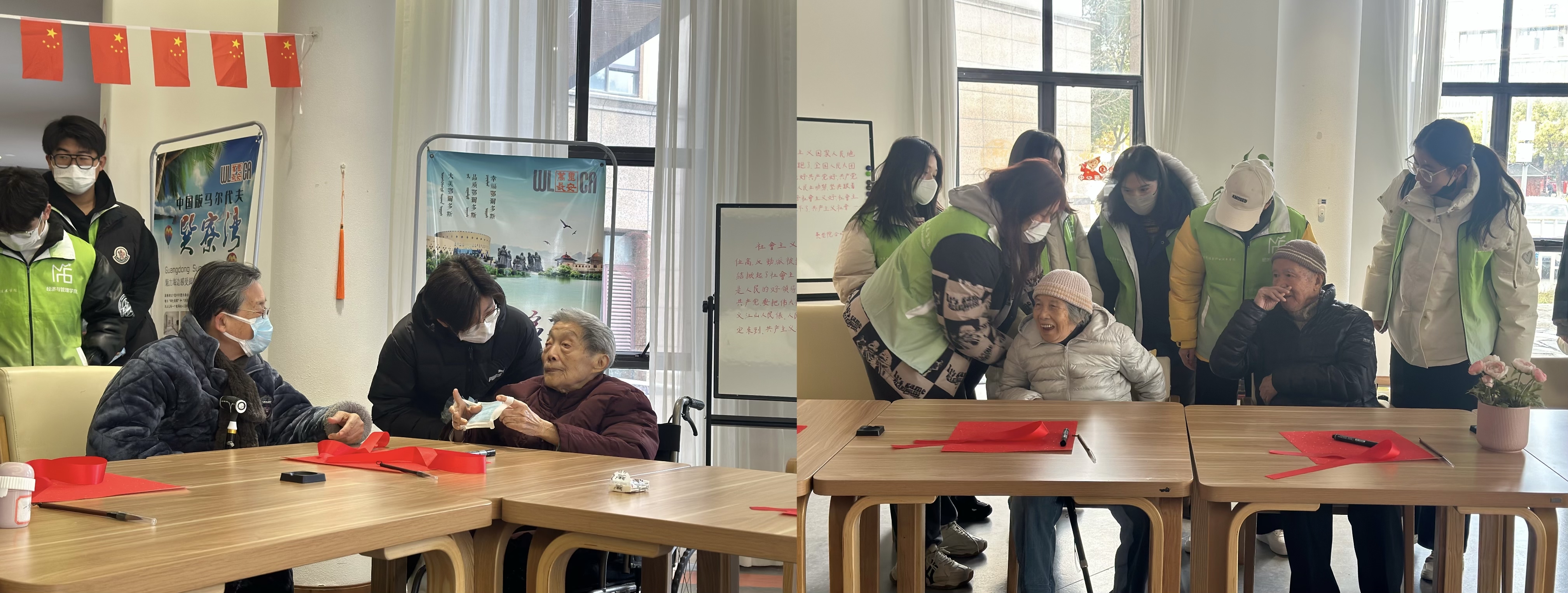 志愿者在一旁挥毫泼墨,为老人们写下一个个“福”字,并将这些“福”字贴在窗户上,为敬老院增添一份喜庆的氛围。此外,志愿者们还为老人们系上红丝带,表达了对老人们的祝福与关爱。养老院院长叶晓霞对我们全体志愿者表达了一番肺腑之言,她表示:“在自己长久的人生规划中,我们应该让每一段生命力的程度都有意义,并且能够体现自己的价值,这是我们每位同学要进行思考的。而此次养老院志愿公益活动,是人生的一个新思考启发的切入点。所以要在这些深度的生命意义上去思考,思考我们为什么来参加这次活动。当大家真正的去深入思考这次活动意义的时候,每个人将会受益匪浅。”