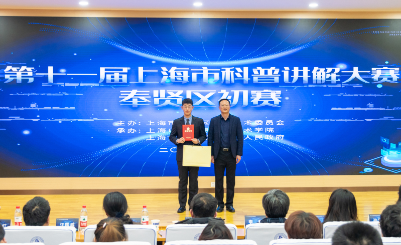 奉贤区科学技术委员会一级调研员汪国威为上海电子信息职业技术学院颁发优秀组织奖。