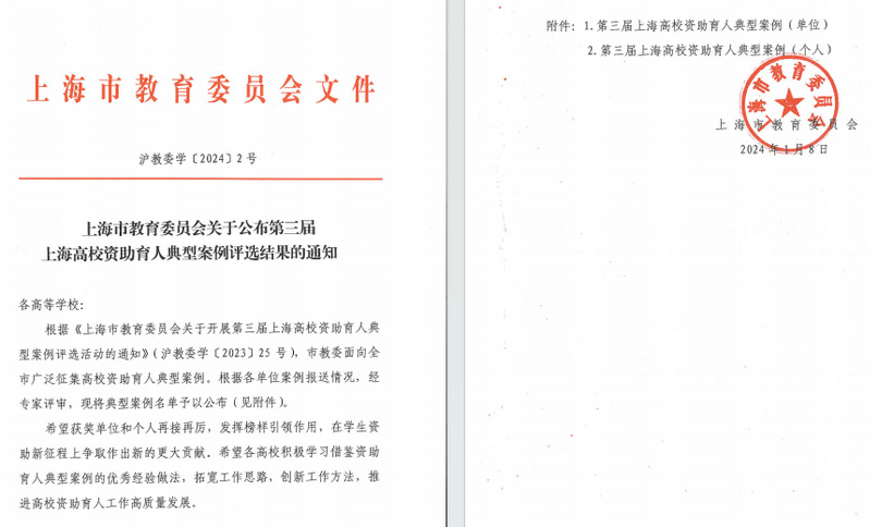 据悉,2023年6月,为全面贯彻落实党的二十大精神,践行新时期资助工作新使命,总结宣传推广上海高校资助育人工作的好做法和好经验,进一步提升上海高校资助工作水平,市教委启动了第三届上海高校资助育人典型案例评选活动。全市高校范围内共评选出典型案例(单位)23项、典型案例(个人)94项,其中个人案例一等奖15项、二等奖20项、三等奖25项。我校高度重视,精心组织校内征集评选活动,面向有关职能处室、二级学院广泛征集,经校内评审后,评选出4篇案例参加上海市评审,最终全部入选。
