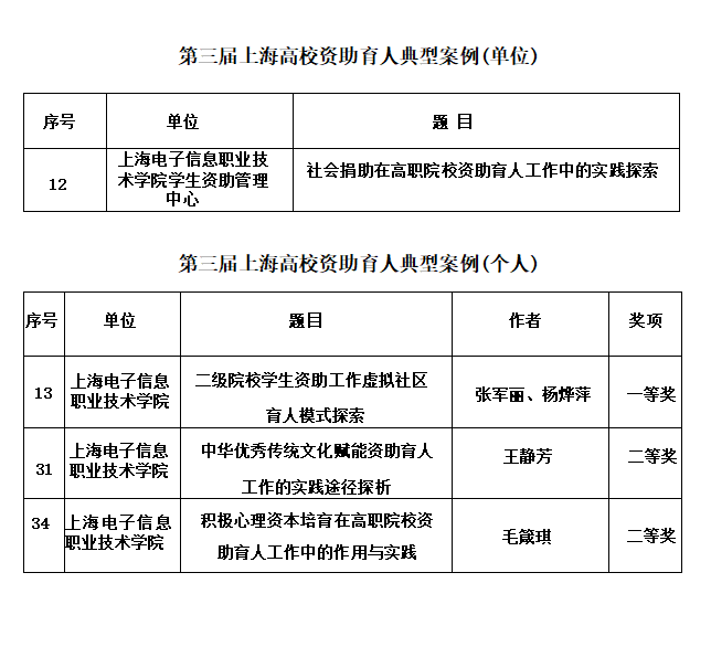 近日,上海市教育委员会发文公布第三届上海高校资助育人典型案例评审结果。我校4项案例成功入选,其中,学校学生资助管理中心《社会捐助在高职院校资助育人工作中的实践探索》被评选为第三届上海高校资助育人典型案例(单位);电子技术与工程学院《二级院校学生资助工作虚拟社区育人模式探索》(作者:张军丽、杨烨萍)荣获典型案例(个人)一等奖;设计与艺术学院《中华优秀传统文化赋能资助育人工作的实践途径探析》(作者:王静芳)、学生处《积极心理资本培育在高职院校资助育人工作中的作用与实践》(作者:毛箴琪)分别荣获典型案例(个人)二等奖。