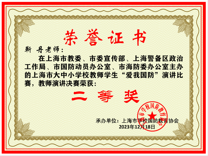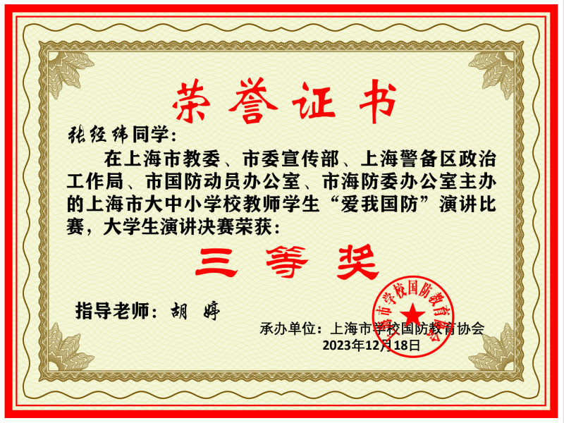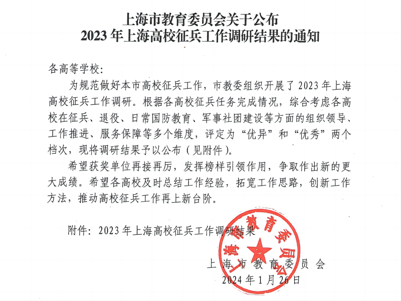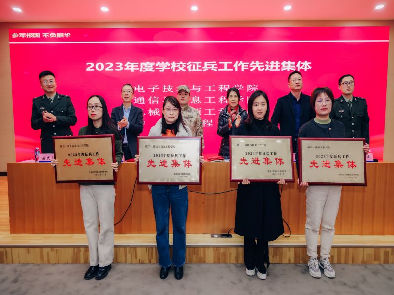 征兵工作是学校落实“立德树人”根本任务的重要举措,把征兵工作融入大思政格局,充分发挥征兵工作育人育心的作用。2023年上海市第三届高校大学生风采展示评选活动中,我校国防军事类社团“铸魂团”荣获“风采团体”奖,通信学院赵一博同学荣获“风采团队优秀学生干部”,武装部潘飞老师荣获“风采团队优秀指导老师”;2023 年上海市大中小学校教师学生爱我国防演讲比赛中,通信学院靳丹老师荣获老师组二等奖,通信学院张经纬同学荣获大学生组三等奖。