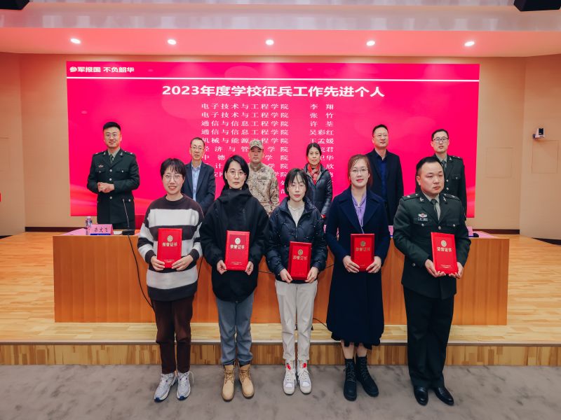 会上对2023年学校征兵工作中做出突出贡献的先进集体和个人进行了隆重表彰。吴奇峰宣读学校2024年上半年45名预定新兵名单及分配情况。