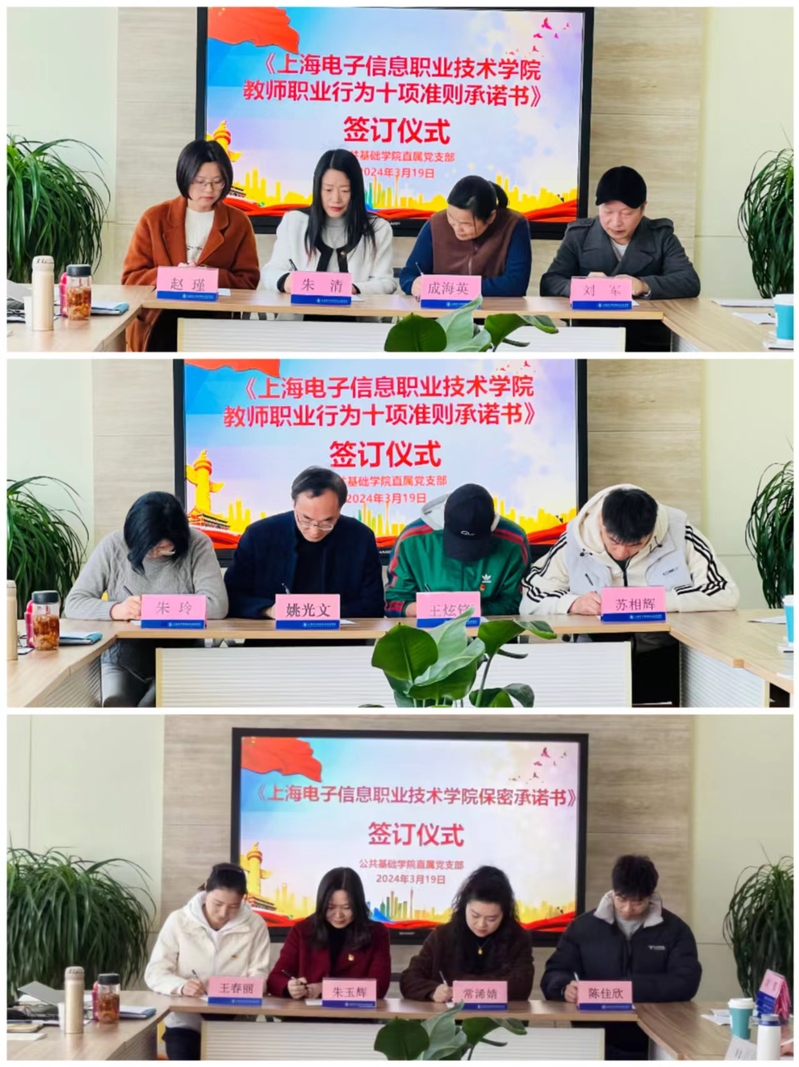 常浠婧老师带领教师认真学习了《教育部关于高校教师师德失范行为处理的指导意见》《上海电子信息职业技术学院教师职业行为十项准则承诺书》两份重要文件。朱清与姚光文分别带领各教研室主任及教师代表签订《上海电子信息职业技术学院教师职业行为十项准则承诺书》。通过签订承诺书,要求每一位教师自觉把职业行为规范到“准则”的要求上来,并在日常的教育教学等过程中严格贯彻落实。