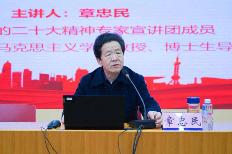 3月20日,学习贯彻习近平总书记考察上海重要讲话精神宣讲暨党员教育培训会在C108报告厅举办。上海市党的二十大精神专家宣讲团成员、上海财经大学教授章忠民来校作《解码习近平总书记在上海市考察》辅导报告。校领导、全体中层干部、党支部书记、马院教师、全体党员及民主党派代表参会,会议采用线上与线下相结合的方式进行。宣讲会由校党委书记傅建勤主持。