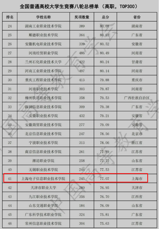 近日,中国高等教育学会高校竞赛评估与管理体系研究专家工作组发布《2023全国普通高校大学生竞赛分析报告》,全国1254所高职院校(包括职业大学)纳入。我校以245个奖项数量、总分77.07分,位居全国普通高校大学生竞赛八轮总榜单(高职)第41名。