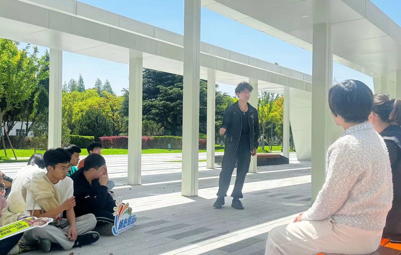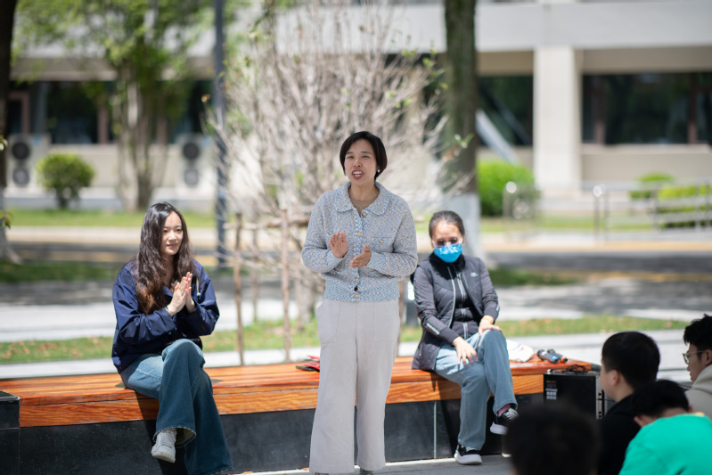 同学们在温暖春日阳光的沐浴下,吟诵中国传统诗歌并发表自己的理解。