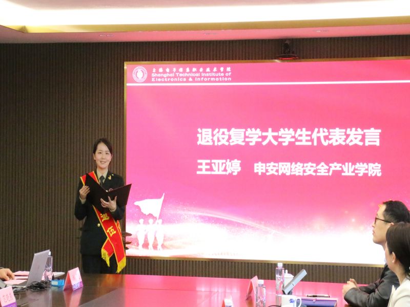 退役复学大学生代表、申安网络安全产业学院王亚婷发言分享了个人的军旅生涯,感谢学校老师对入伍学生的关怀和帮助,表示将退伍不褪色,积极参与学校军训、征兵宣传等工作,为学校发展贡献力量。