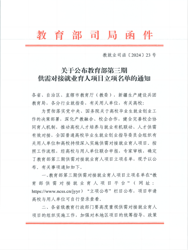 供需对接就业育人项目是教育部贯彻落实党中央、国务院“稳就业”“保就业”决策部署的举措之一,旨在深化高等教育改革,推动就业与培养有机联动、人才供需有效对接。第三期供需对接就业育人项目分为就业实习基地建设、定向人才培养培训、人力资源提升、重点领域校企合作、重点群体就业帮扶五类。我校获批教育部第三期供需对接就业育人项目立项名单如下: