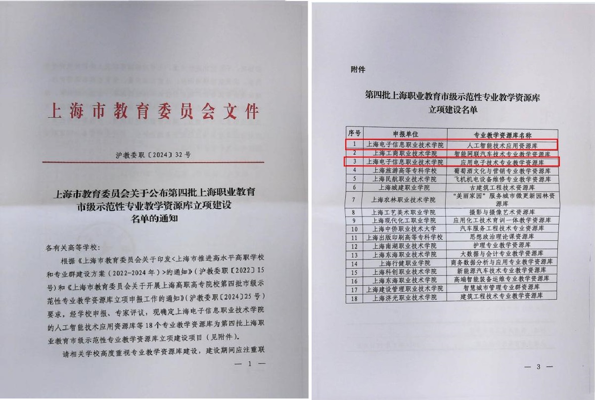 8月28日,上海市教育委员会公布了《第四批上海职业教育市级示范性专业教学资源库立项建设名单》,我校《人工智能技术应用资源库》《应用电子技术专业教学资源库》获批立项建设。