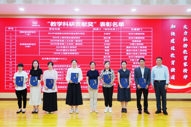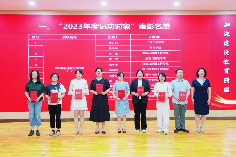 党委宣传部部长张贯彻依次宣读颁奖词。校领导窦争妍、徐德明、方林中分别为“2023年度记功对象”“创学校荣誉奖”“教学科研贡献奖”获奖集体和个人代表颁发荣誉证书。