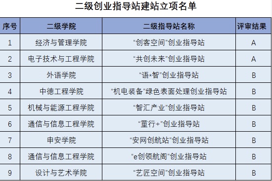 经过二级学院的申请和现场答辩评审,首批新建的二级创业指导站共有9个,它们分别是“创客空间”创业指导站、“共创未来”创业指导站、“语·智”创业指导站、“机电装备”绿色表面处理创业指导站、“智汇产业”创业指导站、“童行+”创业指导站、“安网创航站”创业指导站、“e创领航阁”创业指导站以及“艺匠空间”创业指导站。在答辩过程中,“创客空间”创业指导站和“共创未来”创业指导站表现突出,最终获得了三位专家的一致评定,被评为A级;其余7个二级创业指导站则被评为B级。