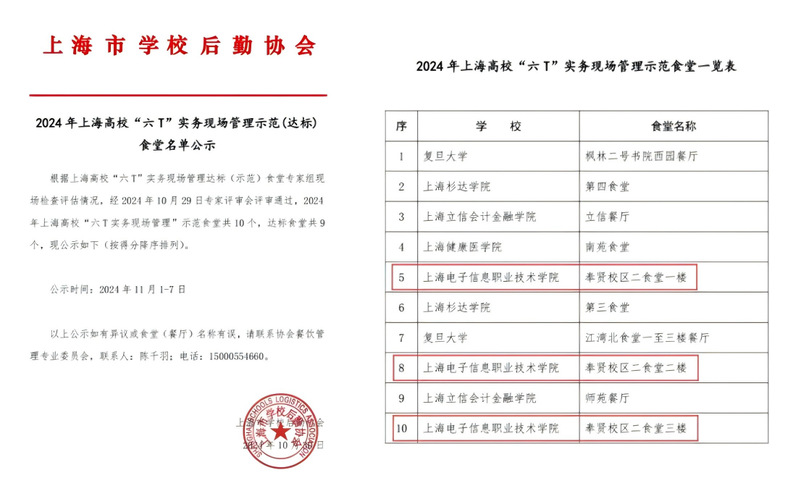 近日,上海市学校后勤协会公示2024年上海高校“六T”实务现场管理示范(达标)食堂名单,我校奉贤校区二食堂三个餐厅均获评上海高校“6T”示范食堂。