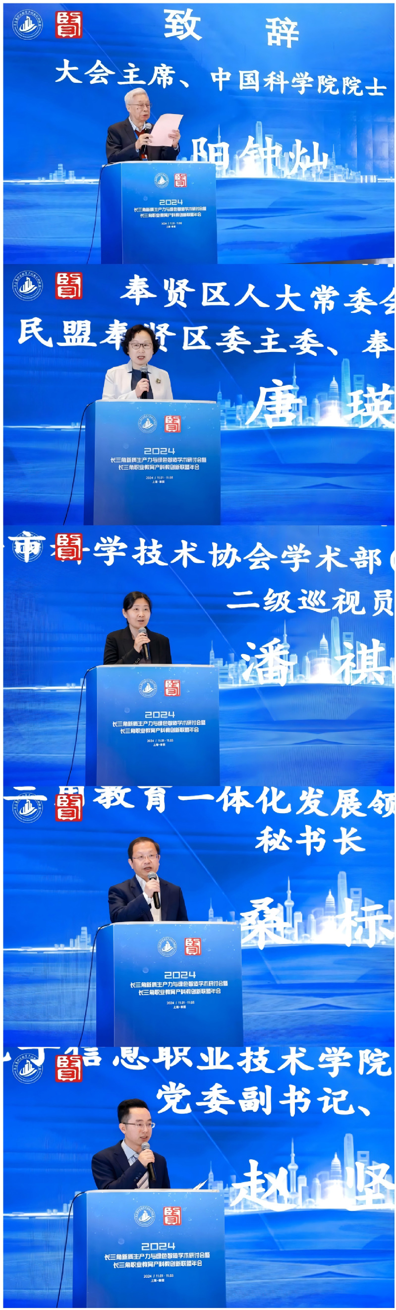 欧阳钟灿院士,奉贤区人大常委会副主任、区科协主席唐瑛,上海市科协学术部部长、二级巡视员潘祺,长三角教育一体化发展领导小组办公室总秘书处秘书长桑标,长三角职业教育产科教创新联盟理事长、上海电子信息职业技术学院党委副书记、院长赵坚先后致辞。