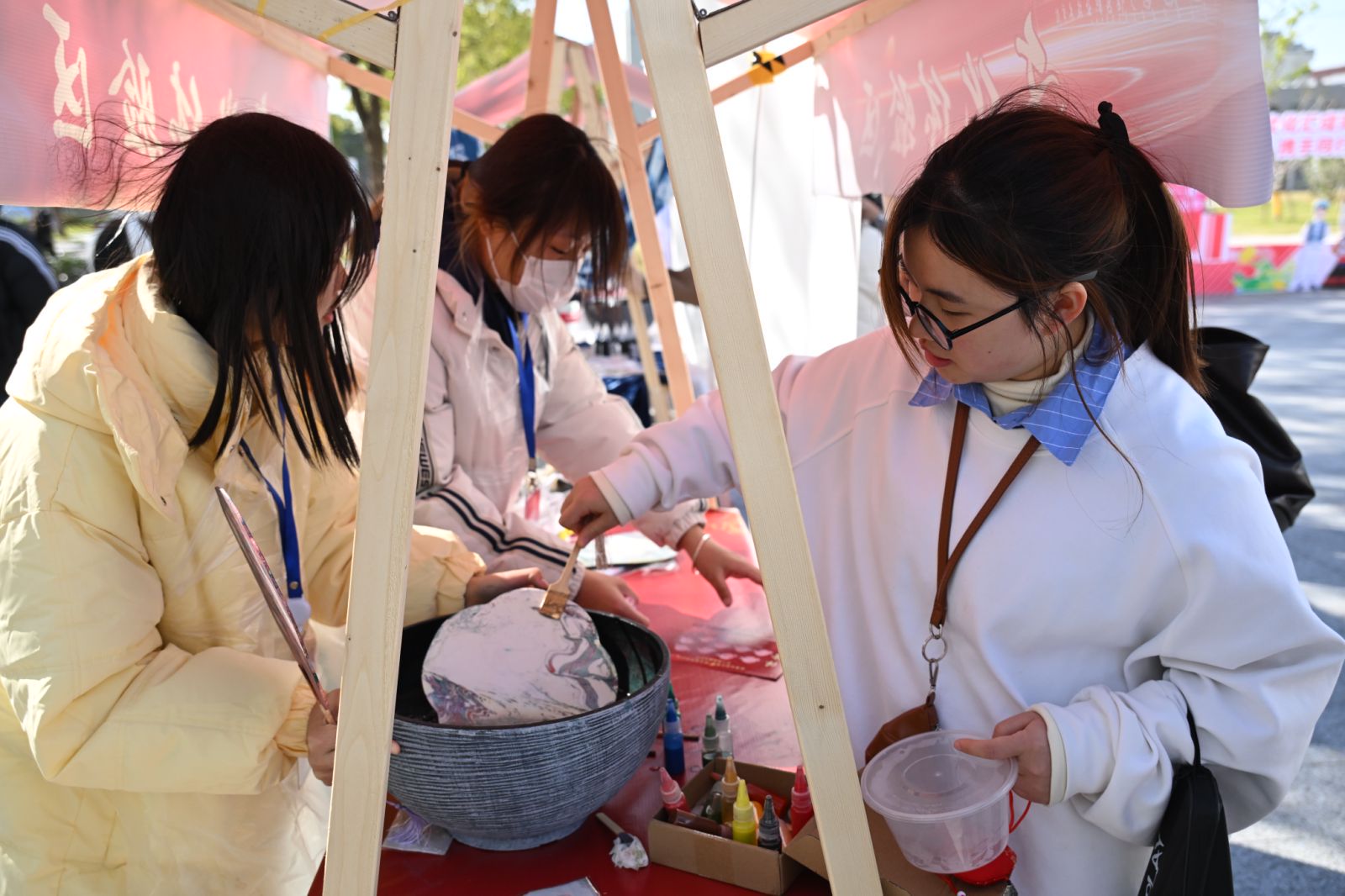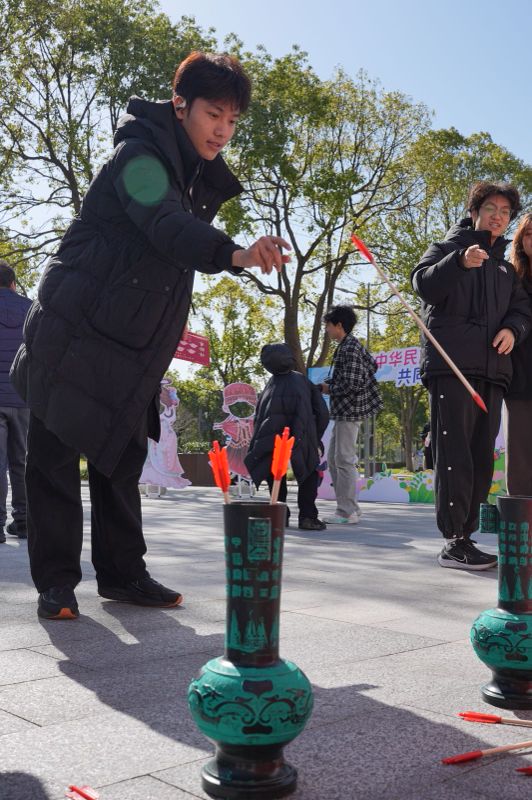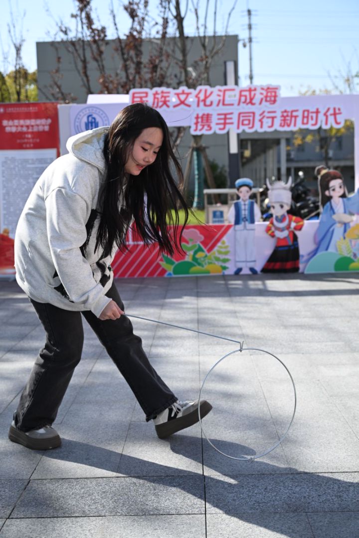 游戏体验区中,同学们滚动着面前的铁环,回忆起儿时的槐花香;传统的射箭、投壶、蹴鞠等项目更是让同学跃跃欲试。