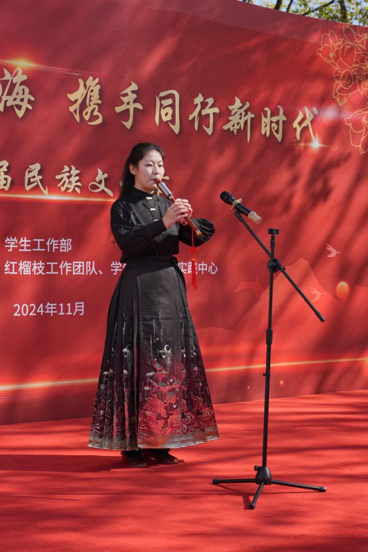 傅建勤宣布第一届民族文化节正式启动。文艺汇演上,各民族学生通过歌曲、舞蹈、朗诵、乐器演奏等丰富形式,编织出一幅幅流动的民族文化画卷。每一个节目,都是对民族文化的深情致敬,每一次掌声,都是对民族团结的热烈回应。同学们用多元的文化、团结的信念、交融的情感展示校园文化育人的靓丽风景,共同奏响中华民族一家亲的和谐旋律。