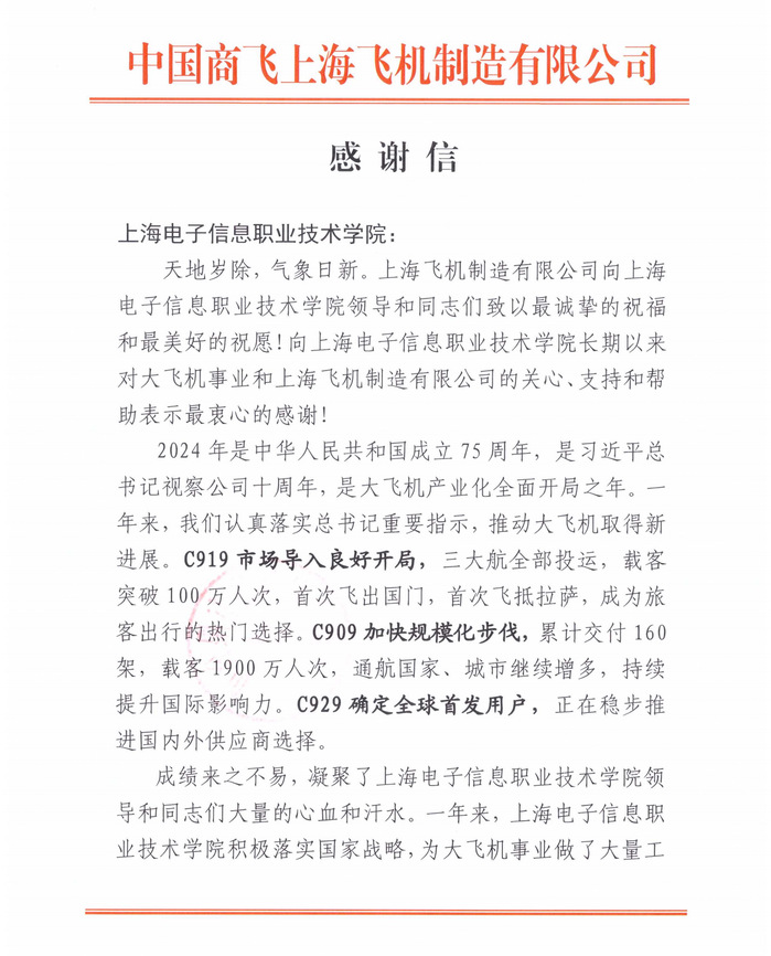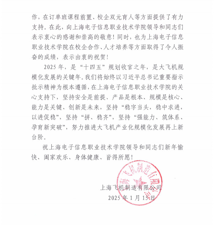 来信指出,2024年,中国商飞上海飞机制造有限公司在推动大飞机事业方面取得了新进展,C919市场导入良好开局,C909加快规模化步伐,C929项目稳步推进。上海电子信息职业技术学院积极落实国家战略,为大飞机事业做了大量工作,在订单班课程前置、校企双元育人等方面提供了有力支持,自2018年以来为中国商飞上海飞机制造有限公司输送了200余名学生,公司对学院的贡献表达了衷心的感谢与崇高的敬意,也对学校在校企合作、人才培养等方面取得了令人振奋的成绩表示由衷的祝贺,期待在上海电子信息职业技术学院的关心与支持下,努力推进大飞机产业化规模化发展再上新台阶。