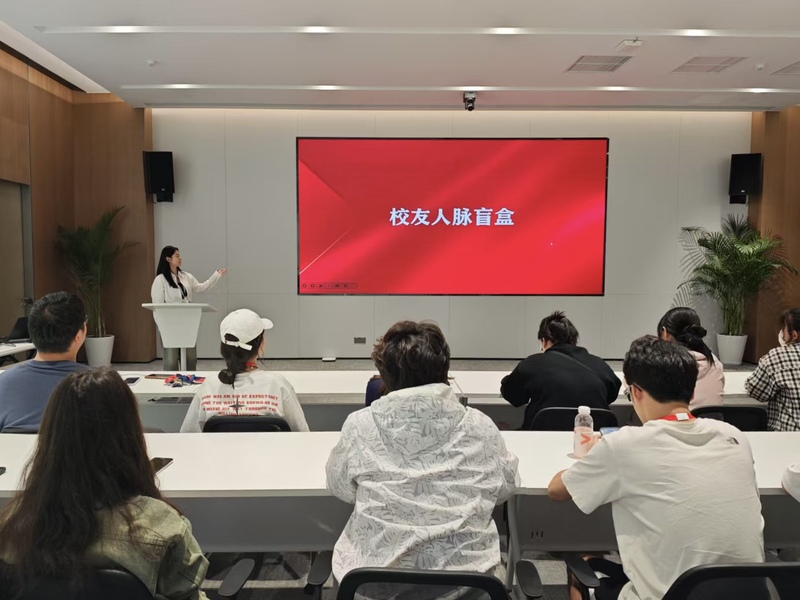 在现场讨论交流环节中,同学们就企业发展战略、岗位设置、实习要求、晋升机制等问题热烈提问,积极与学长进行深入交流。在“时光胶囊”环节中,校友蒲晓璇跟同学分享了自己三年后的职业期待,提醒同学们提早进行职业规划,明确目标。“校友人脉盲盒”环节,学姐现场随机抽取了5位同学获得校友一对一实时咨询机会,后续同学们有任何求职问题可以随时咨询校友,并把咨询后的感悟及时分享到自己班级群。