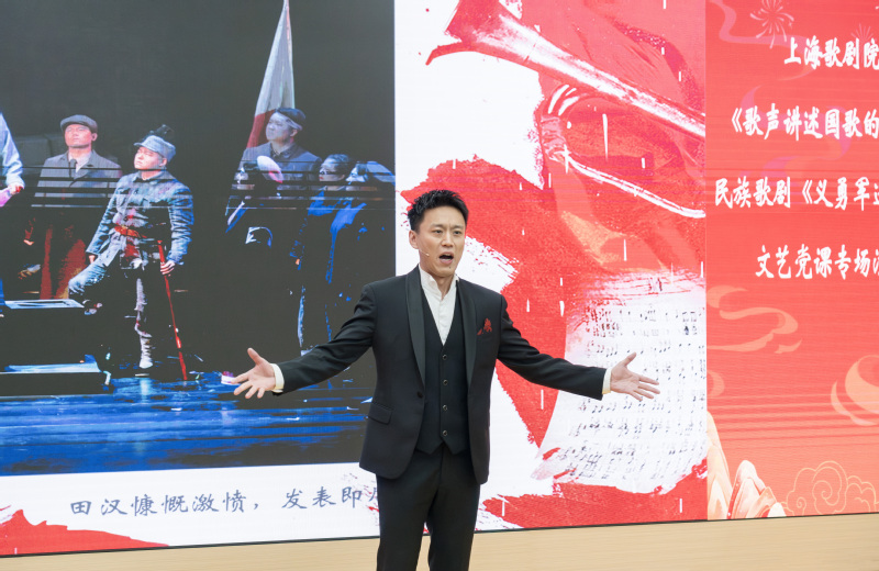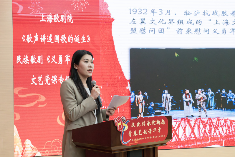 来自上海歌剧院的女中音歌唱家苏绘缨以及青年歌唱家于浩磊、黄俊鹏、李忻润、杨丽莹、肖昕怡,为师生带来高雅艺术进校园之《歌声讲述国歌的诞生》文艺党课专场演出。苏绘缨老师结合原创民族歌剧《义勇军进行曲》的创作背景和编导历程,介绍了歌剧的主要内容。青年歌唱家们以饱满热情演绎了剧中的经典曲目,包括《我要加入中国共产党》《我的武器》《我生长在北平城》《凤凰的再生》和《字字重千钧》。他们通过艺术手段,生动地复现了革命年代的精神风貌。在演出高潮部分,苏绘缨老师与青年歌唱家们引领全体师生共同高唱国歌,为这场专场演出画上了一个铿锵有力且令人难忘的句号。在激昂的旋律中,师生们仿佛穿越时空,沉浸式地体验了那段波澜壮阔的革命岁月,深刻地感受到了革命先辈们“为有牺牲多壮志”的崇高精神。