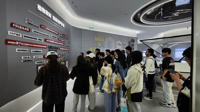 期间,教师与学生们参观了格尔软件松江基地的密码工场。讲解员带领团队参观了各行各业的密码落地场景,了解了格尔软件产品的广泛使用范围,包括上汽的智能汽车的应用、医疗、银行系统应用动态等。学生们了解了格尔软件自主可控的商业密码技术及相关知识产权,以及格尔软件公司的20年奋斗历程和产品迭代过程。随后,教师与学生们参观了上海信创中心展厅。了解了中国信创历史、上海市信创历史的发展状况、未来前景。参观的同学偶遇了我校毕业生罗睿恒同学,他刚刚被信创中心录用。学长的经历激发了学生们学习专业的兴趣和信心。