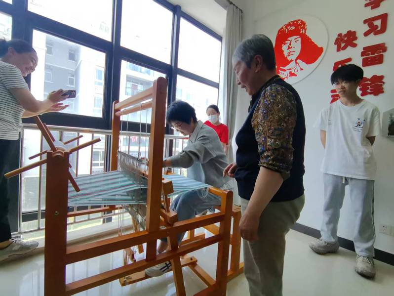 在手工体验环节,师生跟着陈老师制作“福禄”葫芦艾草包:填充社区自种手工研磨的艾绒、缝制吉祥纹饰、搭配环保材料装饰。看到一枚枚绣着“平安健康”的艾草包在手中成型,入党积极分子姜垚同学感慨:“原来传统文化不是橱窗里的展品,而是能握在手里、用在生活中的烟火气。”随后党支部书记张晶老师与党总支副书记施云美老师跟随手艺传承人宋阿姨来到传统织布机前,在经纬穿梭间感受传统技艺的魅力,沉浸式感受着“一丝一缕皆匠心”的传统技艺温度。