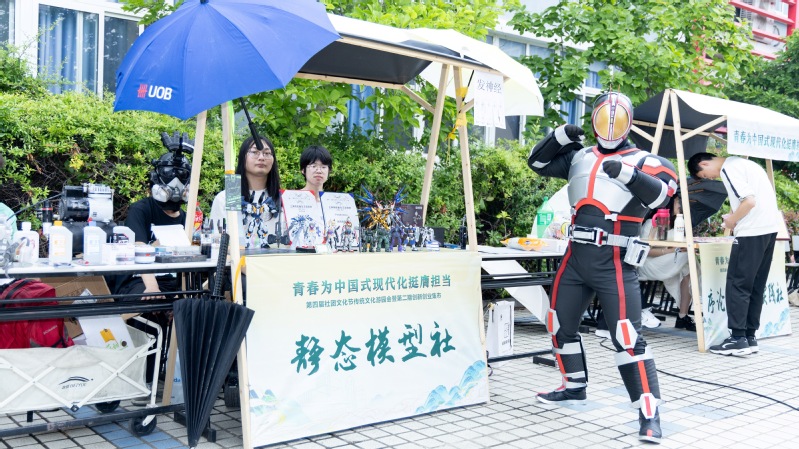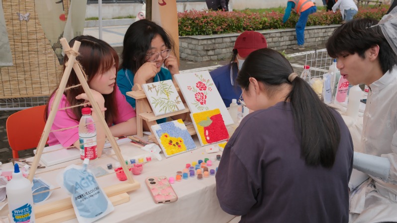 多元文化交融:一场“行走的思政课堂。活动突破传统形式,以“游园打卡”为载体,通过体验式、互动式教育实现文化浸润。在传统文化互动区,汉服社、书法社等社团通过“非遗技艺体验”“诗词飞花令”“传统民乐展演”等环节,让师生亲身感受中华文化的深厚底蕴。创新创业集市区集中展示学生创业团队成果,智能机器人、环保文创等多个项目吸引师生驻足观看。其中,“古法香珠+现代设计”跨界作品广受校内外师生好评,彰显“老传统”与“新潮流”的碰撞火花。青春社彩展示区集结25个学生社团,合唱团、无人机社等通过动态展演、互动教学展现社团育人成效。学生主持人唐晓薇说:“从旁观者到参与者,我们真正成为了校园文化的主人。”