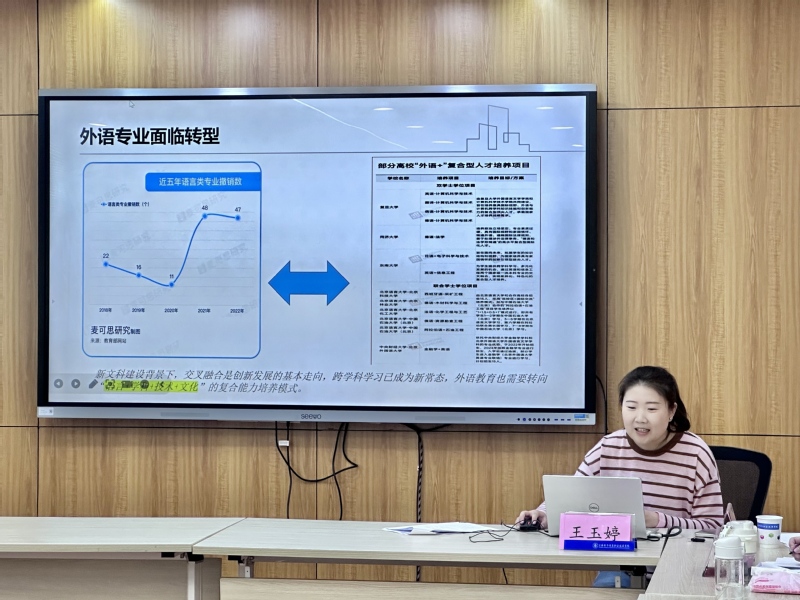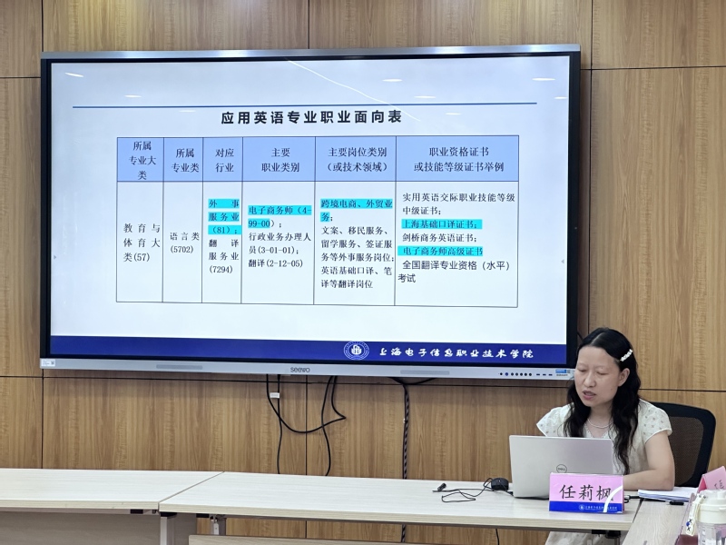 应用德语专业主任王玉婷围绕“AI赋能国际数字贸易微专业”进行了专题汇报。她详细介绍了微专业的建设背景、课程体系与人才培养特色。该微专业融合德语教学、跨境数字贸易与人工智能技术,采用“岗课赛证”一体化教学模式,面向中德贸易、AI应用企业及创业方向,旨在培养具有国际视野与技术素养的复合型外语人才。