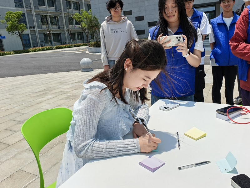 活动现场,“幸福打卡墙 ——emo 退退退”成为同学们倾诉快乐的窗口。“清晨遇见的第一缕阳光”“课堂上学会的英语单词”“网购了一顶很喜欢的帽子”,这些看似微小而又饱含温度的生活琐事,被同学们认真书写在打卡墙上。学生们的每一笔记录,都是对生活的热爱,更是对负面情绪的有力回击。