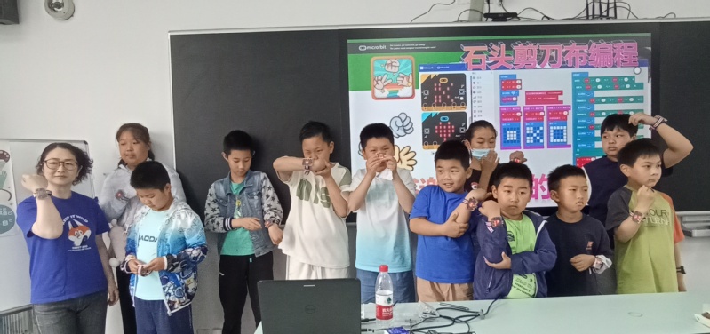 “石头剪刀布编程”体验项目同样精彩纷呈。中小学生在我院师生悉心指导下,从零开始学习单机版本的石头剪刀布小游戏编程。随着一行行简单代码的输入,手中的microbit设备仿佛被赋予了生命,生动展示出石头、剪刀、布的图案,成功实现游戏基本逻辑,让孩子们初尝编程的乐趣。紧接着,活动难度升级,蓝牙互动版本的挑战激发了孩子们的探索热情。小朋友们两两结对,借助蓝牙通信技术,实现了双方互动的游戏体验,在合作与竞争中,进一步领略到电子技术的神奇魅力。