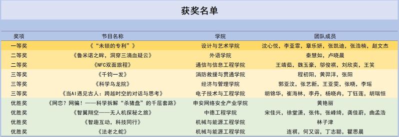 本次大赛以“科学+艺术”融合为核心,为学生搭建跨学科实践平台,激发了科学热情与传播能力,营造了浓厚的校园科技文化氛围,展现了新时代大学生的创新风采与昂扬风貌。未来,学校将持续深化文化育人与科普教育融合机制,丰富校园文化活动,引导青年学生以青春智慧回应时代之问。(供稿:外语学院)