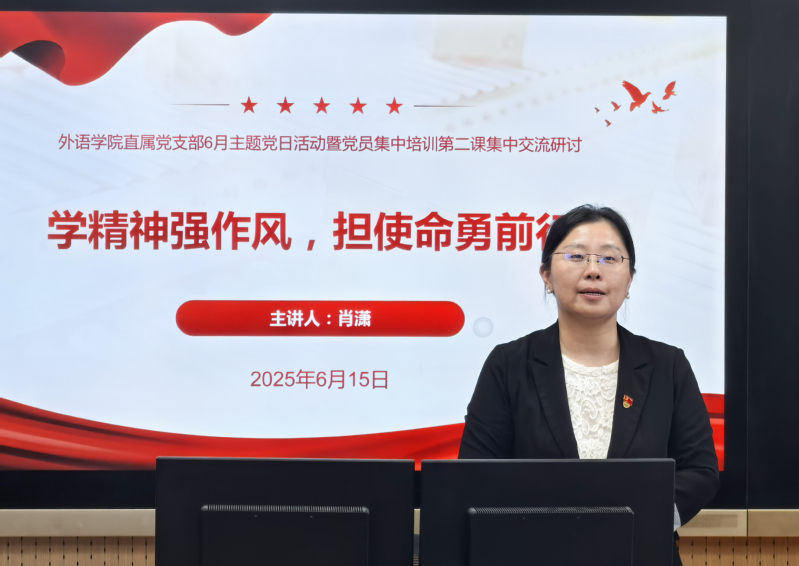 为扎实开展深入贯彻中央八项规定精神学习教育,持续推进党的作风建设,6月16日,外语学院直属党支部组织全体党员在A111开展“学精神强作风,担使命勇前行”主题党日活动暨党员集中培训第二课交流研讨。活动通过专题党课、警示教育、交流研讨等环节一体推进“学查改”,进一步凝聚思想共识,强化责任担当。