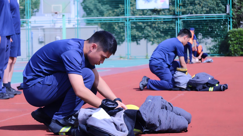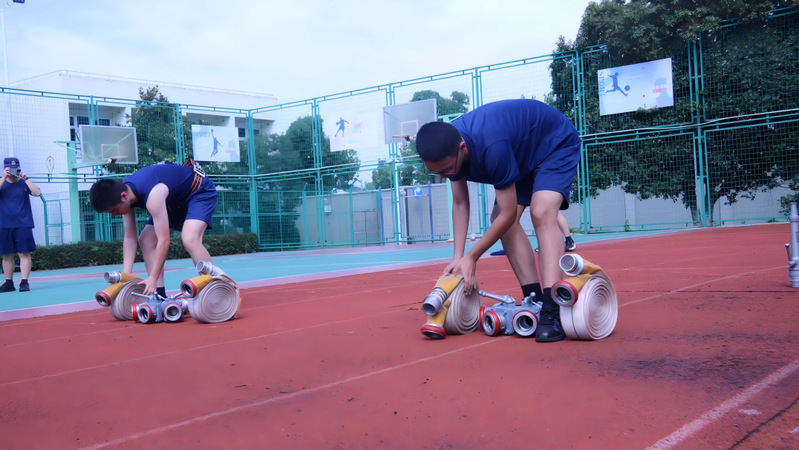 在原地装备穿戴项目现场,参赛选手动作行云流水,快速且规范地穿戴好防火服、头盔及安全带,每一个步骤都精准到位,他们对装备操作的高度熟练度,彰显出日常训练的扎实成效。而在两带一枪铺设水带项目中,参赛学生以标准规范的转身抛带动作,迅速完成水带展开与水枪连接。闵行区消防救援站站长助理刘赵杨担任评委并给出专业评价:“选手们的水带铺设操作达到了专业训练的基本要求,表现值得肯定。”