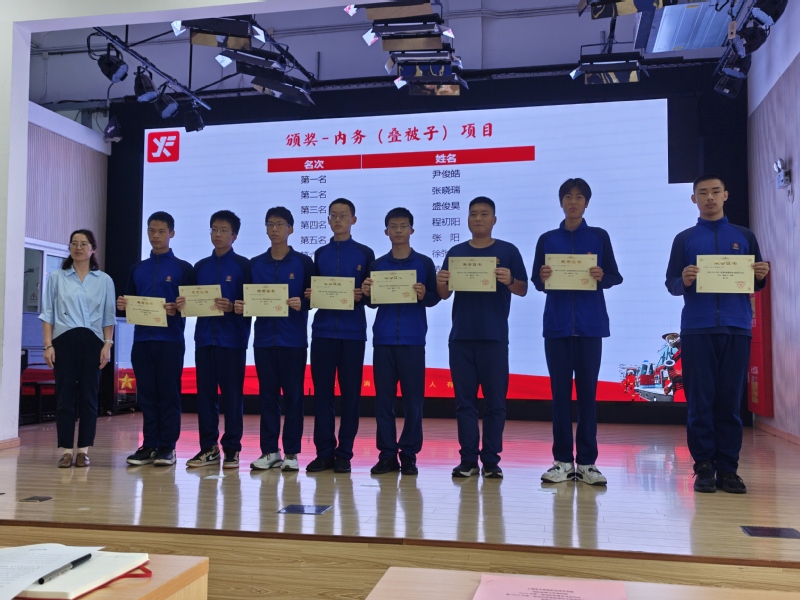 内务赛项则是对学生日常习惯的一次严格检验。赛场上,参赛选手或跪或蹲,专注认真地按照标准叠被子,不放过任何一个褶皱,将对细节的极致追求和对整洁的执着态度展现得淋漓尽致。在队列评比环节,各班精神抖擞、步伐整齐,充分展现出积极向上的精神面貌。