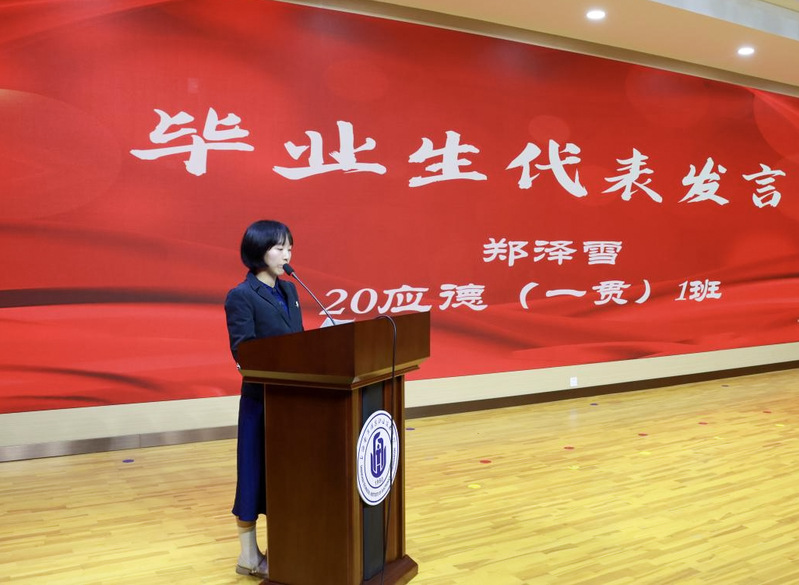 上海市优秀毕业生郑泽雪同学作为毕业生代表发言,回顾了在校园里的点点滴滴,从青涩到成熟的华丽蜕变,感谢老师们耐心的知识传授与人生指引,提及和同窗并肩奋斗的日子满是珍视。她表示,新征程已至,会带着在校园沉淀的勇气与信念,无畏挑战,在未知中书写独属于自己的精彩篇章。
