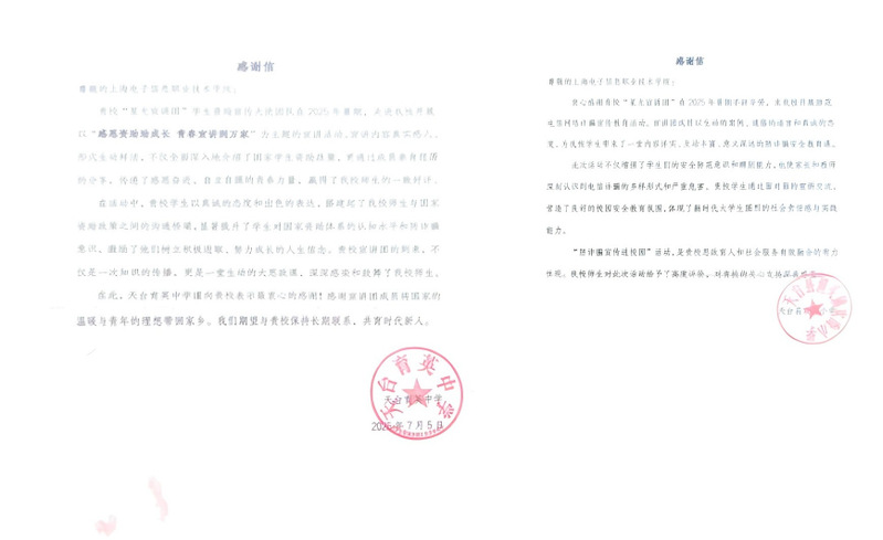 此次天台之行,是资助政策的精准送达,是反诈知识的及时守护,是红色基因的深情赓续,更是孝亲敬老的真情流淌。中德工程学院学子们以“政策+安全+文化+公益”的多维实践模式,用脚步丈量乡情,用行动践行感恩,成功搭建了一座连接高校资源与乡村需求的“暖心桥”。他们以“过来人”的视角点燃希望,以“生力军”的姿态守护平安,以“传承者”的自觉砥砺初心,以“奉献者”的赤诚温暖人心。这不仅是一次社会实践的圆满收官,更是一曲青春向党、反哺家乡的动人乐章,彰显了新时代青年在实现教育公平、助力乡村振兴伟大征程中的蓬勃朝气与无限可能。未来,他们将继续当好政策“传声筒”、乡村“连心桥”,为促进教育公平、赋能乡村振兴注入生生不息的青春动能,共同绘就乡村发展与青年成长交相辉映的美好未来。(供稿:中德工程学院)