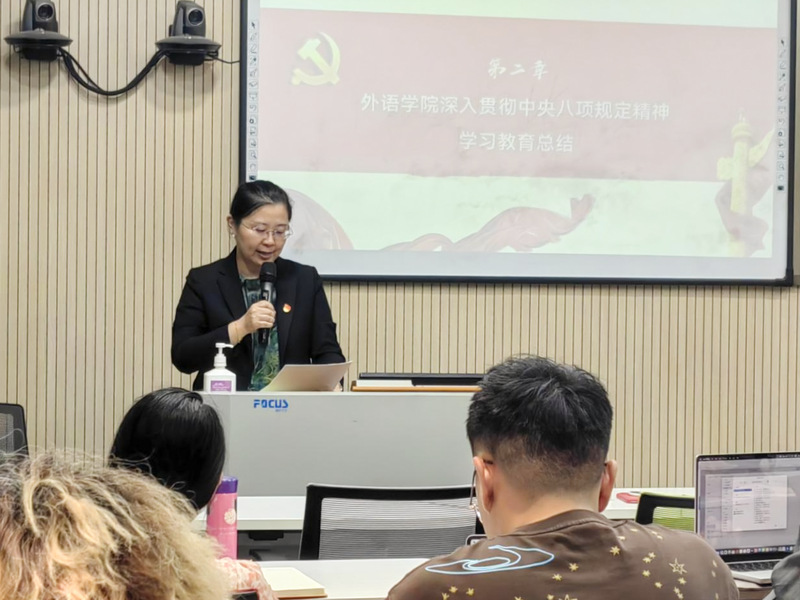 学院直属党支部书记、院长肖潇作外语学院深入贯彻中央八项规定精神学习教育总结。她向全体教职工详细报告了外语学院开展深入贯彻中央八项规定精神学习教育的做法成效、主要特点与经验启示、查摆出的问题及整改情况、工作中存在的差距以及下一步工作计划。肖潇表示,通过此次学习教育,学院在作风建设方面取得了良好成效,但仍需不断努力,持续改进工作作风,不断推进外语学院高质量发展。