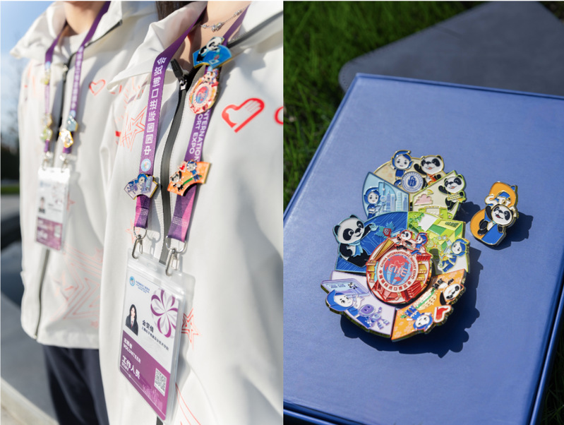 这枚徽章,是身份的铭刻,更是荣耀的见证。巧妙融合校徽与熊猫“进宝”的灵动形象,佩戴于衣领或行囊,顷刻间唤醒专属的进博记忆。作为联名系列的灵魂之作,整套徽章以熊猫“进宝”与学院形象大使“沪小电”为设计核心,八枚独立徽章可拼合成数字8,寓意第八届进博会的辉煌历程。