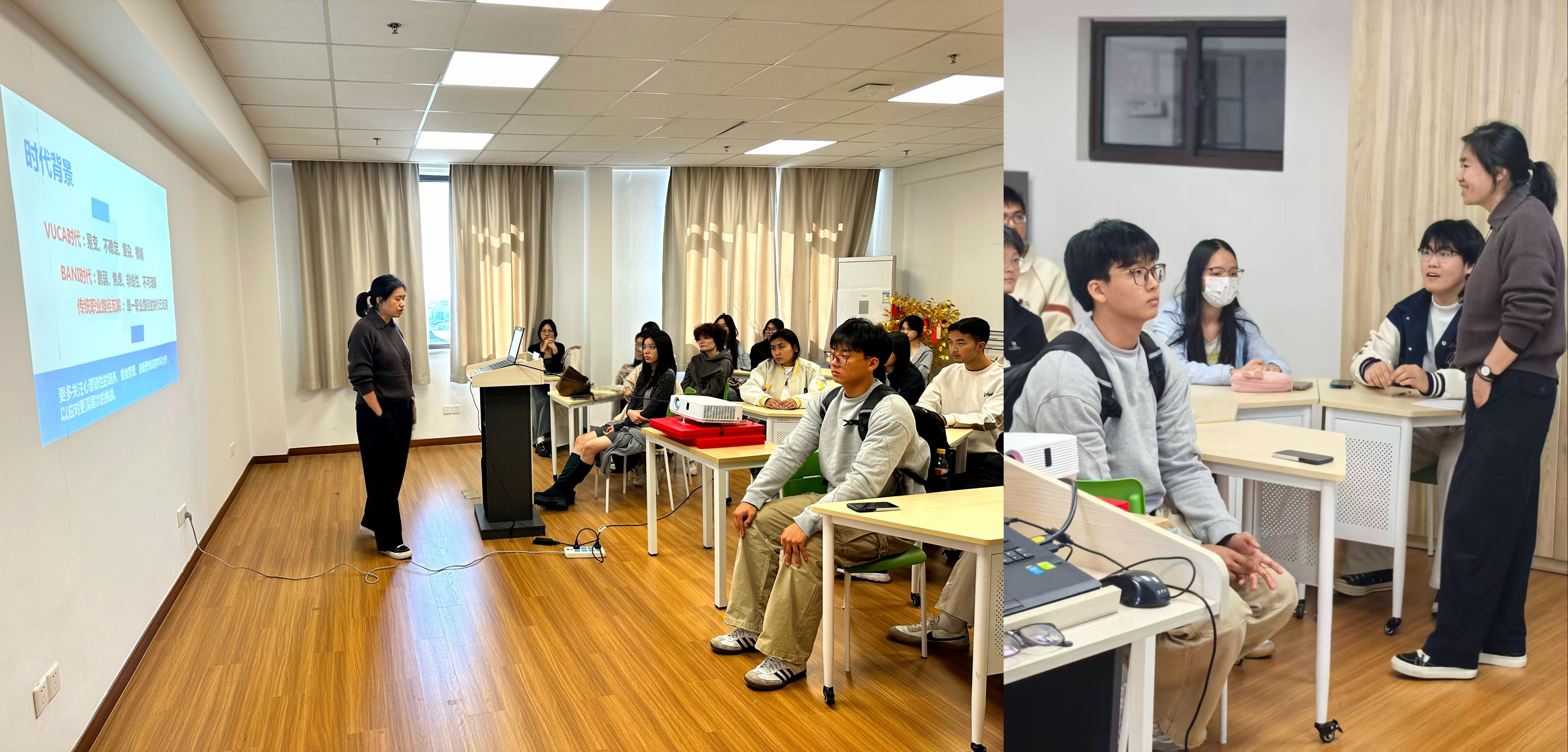 上海杉达学院创新创业学院院长于晓东教授以“从课堂到创新之职业技能与创新融合之路”为题,强调创新源于扎实的知识积累与专业的职业技能,引导学生从“知识输入”走向“价值输出”;上海疆果信息科技有限公司总经理苏钰女士以“创新创业如何赋能你的生涯发展”为主题,讲述其从“专业定向”到“能力跨界”的实战历程,鼓励学生在真实问题中实现从0到1的突破,并迈向从1到N的持续发展;优秀校友、国赛铜奖与市赛金奖项目负责人吴晓奋以“从大赛到职场:我的成长与收获”为题,生动诠释了如何将竞赛经验转化为核心竞争力,构建“大赛-实践-升学-就业”的成长路径。
