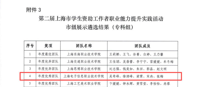 在上海市学生事务中心、上海市教育发展基金会共同主办的“第二届上海市学生资助工作者职业能力提升实践活动”中,来自全市基础教育、中职教育、专科、本科、研究生五个组别的77支团队、400余名学生资助工作者参加展示活动。我校荣获专科组“年度优秀团队”荣誉。