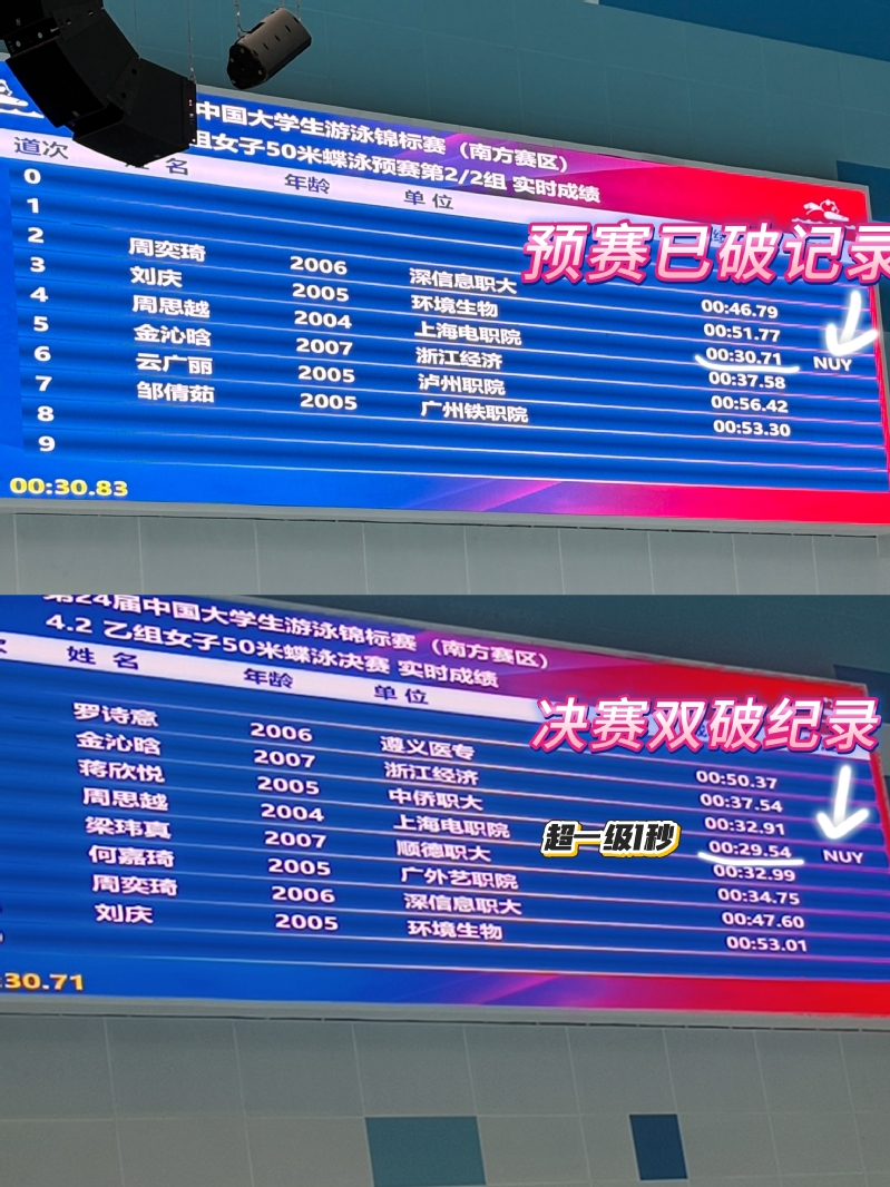 11月10日上午,周思越在50米蝶泳预赛中以30.71秒首次打破赛会纪录。同日下午决赛,她再接再厉,以29.54秒的个人最好成绩再度刷新纪录并强势夺冠。随后在200米混合泳决赛中,她凭借稳定发挥再获一金,最终以双金战绩为我校争光。