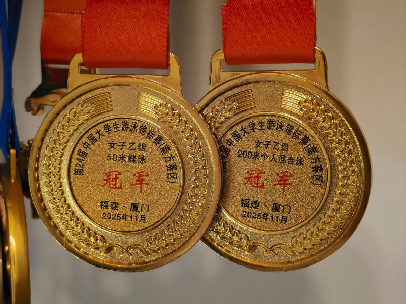 在近日落幕的第24届中国大学生游泳锦标赛(南方赛区)中,我校机械与能源工程学院2023级机电一体化技术2班周思越同学发挥出色,包揽女子乙组50米蝶泳和200米混合泳两枚金牌,并在50米蝶泳项目预、决赛中两破赛会纪录。