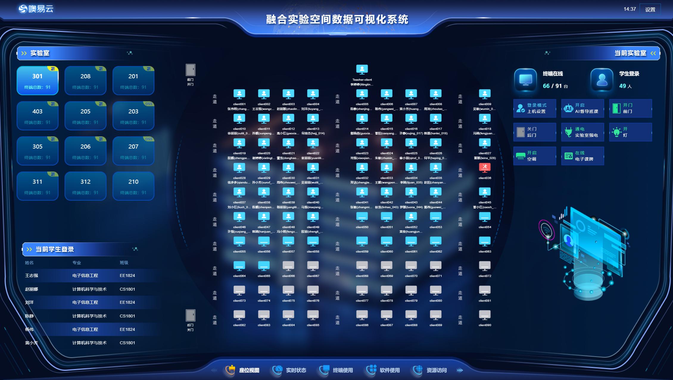 基于IP定位技术,系统生成动态座位视图,支持督导巡课、分组教学、考勤统计等多场景应用。可视化界面实时呈现计算机实训室使用状态,为教学组织优化、课堂互动引导及教学质量评估提供了直观依据。这一创新显著提升了实训教学过程的精细化管理,助力教师实现针对性教学调整。