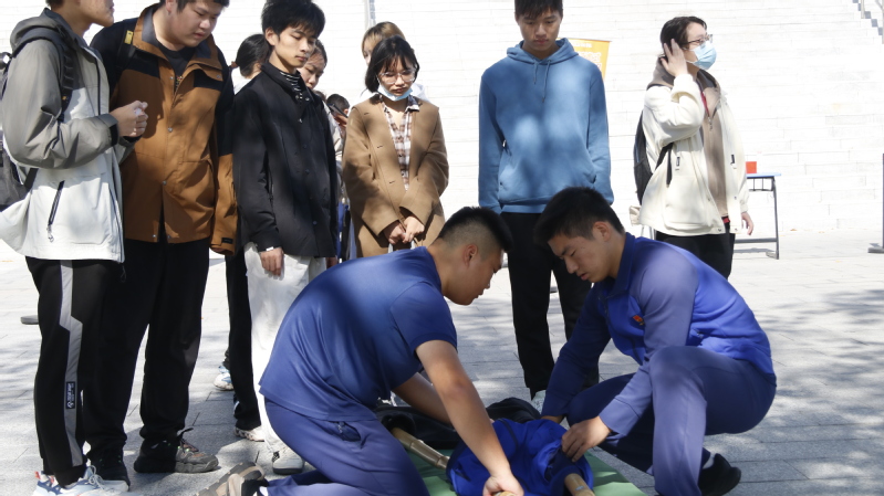 活动设置模拟火灾逃生、安全用电与触电救援、心肺复苏急救等多个体验区,并创新融入水域救援、简易担架制作及消防机器狗展示等特色环节。在我校消防救援专业同学的指引下,师生通过充气仿真舱体验火场逃生、实操模拟电击感受用电风险、借助CPR训练模拟人掌握急救技能,还学习了救生衣穿戴、简易担架制作等实用技巧。作为科技亮点,消防机器狗现场展示了复杂地形越障、火情侦察等功能,展现了科技赋能消防的创新成果。
