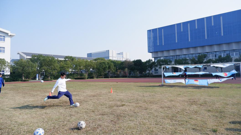 足球定点射门处,选手们脚法灵动,小小的足球承载着团队的期望划出优美弧线。