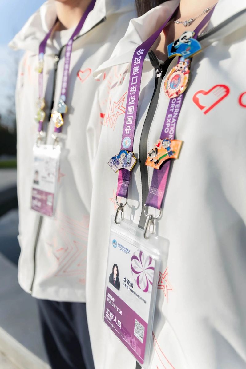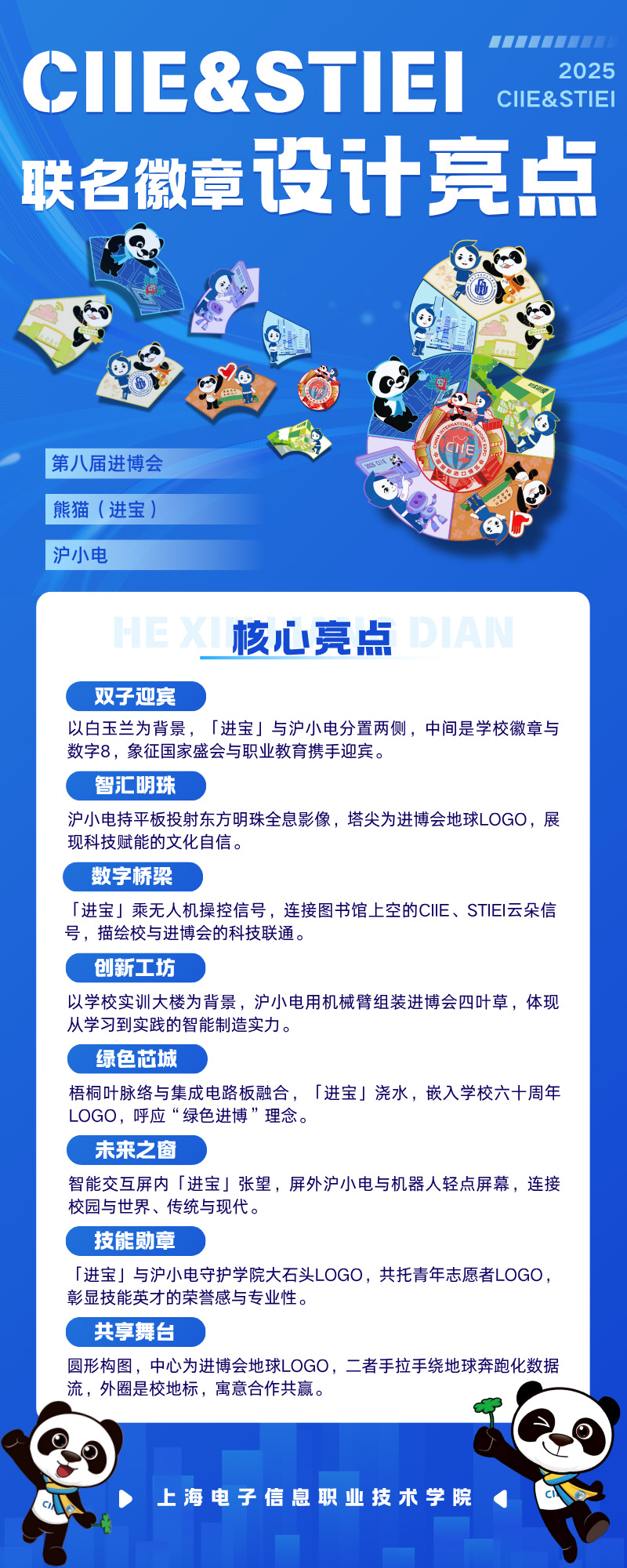 徽章是本次联名的灵魂之作,整套徽章以熊猫“进宝”与学院形象大使“沪小电”为主角,8枚独立徽章可拼成数字“8”,象征第八届进博会。