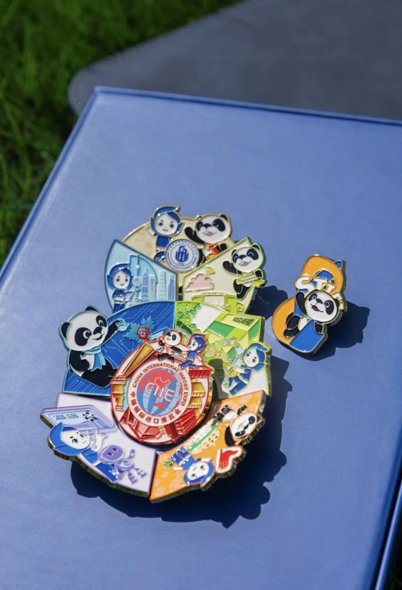 这枚徽章,是身份的象征,更是荣誉的见证。精巧融合校徽与熊猫“进宝”形象,别在衣领或背包上,瞬间点亮你的专属进博记忆。