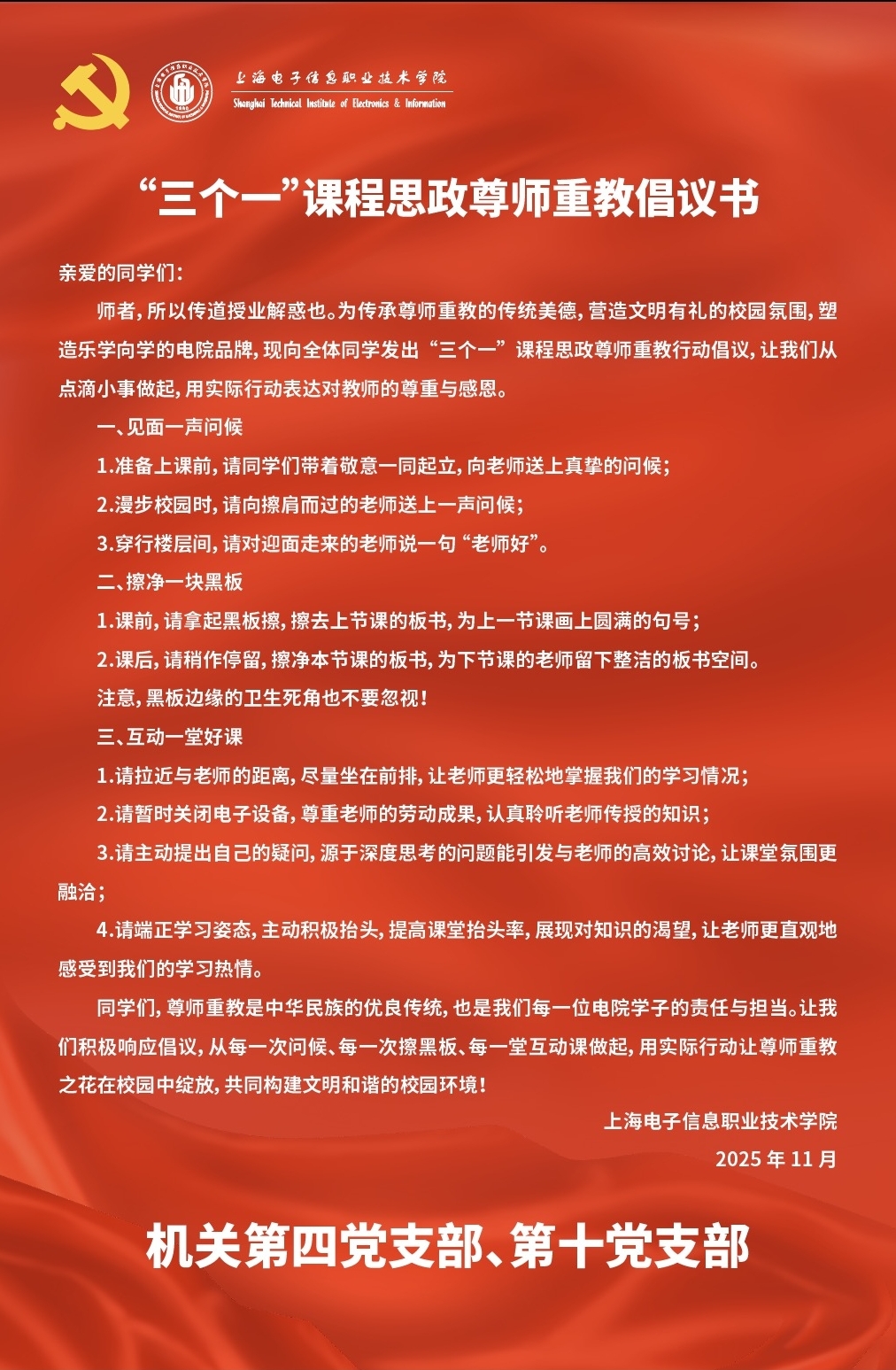 近日,机关第四党支部、第十党支部以课程思政建设为契机,围绕“尊师重教”主题,联合发布“三个一”课程思政尊师重教倡议书,通过海报形式在全校教学楼广泛宣传,号召全体学生践行尊师风尚,营造崇德向善、勤学奋进的校园文化氛围。